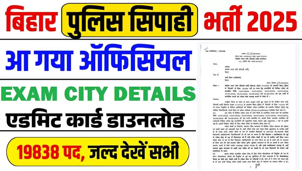 महत्वपूर्ण जानकारी: केंद्रीय चयन बोर्ड (CSBC) ने कांस्टेबल पद के लिए परीक्षा शहर की जानकारी जारी की है। इस भर्ती में कुल 19,838 पदों के लिए आवेदन आमंत्रित किए गए थे। बिहार पुलिस CSBC कांस्टेबल भर्ती 2025 के लिए आवेदन 18 मार्च 2025 से 17 जनवरी 2025 तक स्वीकार किए गए थे। लिखित परीक्षा 16, 20, 23, 27, 30 जुलाई और 03 अगस्त 2025 को आयोजित की जाएगी। जो उम्मीदवार इस फॉर्म के लिए आवेदन कर चुके हैं, वे नीचे दिए गए लिंक से अपने परीक्षा शहर की जानकारी डाउनलोड कर सकते हैं.