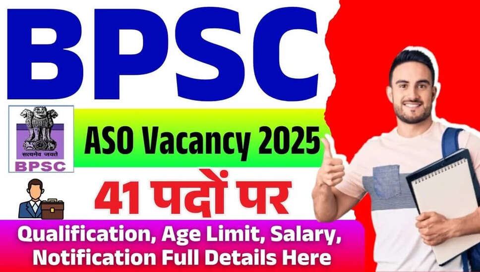 महत्वपूर्ण जानकारी: बिहार लोक सेवा आयोग (BPSC) ने सहायक अनुभाग अधिकारी (ASO) के पद के लिए अधिसूचना जारी की है (Advt.No:37/2025)। इस भर्ती के लिए कुल 41 पदों की घोषणा की गई है। BPSC सहायक अनुभाग अधिकारी भर्ती 2025 के लिए ऑनलाइन आवेदन प्रक्रिया 29 मई 2025 से शुरू हो चुकी है और उम्मीदवार 23 जून 2025 तक आवेदन कर सकते हैं। उम्मीदवारों को BPSC सहायक अनुभाग अधिकारी भर्ती 2025 के लिए सभी विवरणों की जांच करनी चाहिए जो नीचे दी गई हैं।