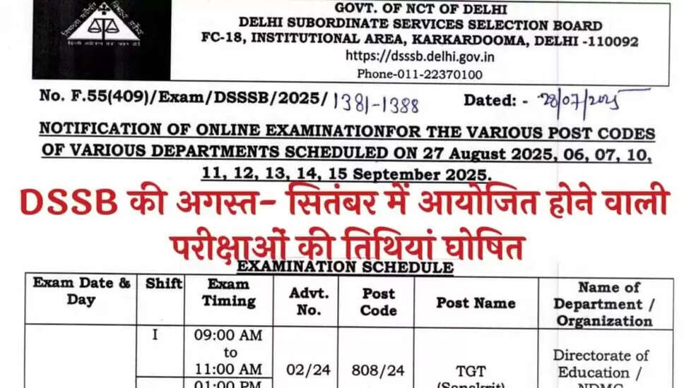 DSSSB अगस्त-सितंबर परीक्षा तिथियों का विवरण