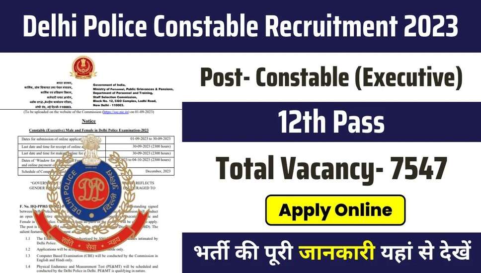 कर्मचारी चयन आयोग (SSC) ने दिल्ली पुलिस कांस्टेबल (कार्यकारी) भर्ती 2023 की घोषणा की है। यह उम्मीदवारों के लिए एक बड़ा अवसर है जो दिल्ली पुलिस के कांस्टेबल (कार्यकारी) के रूप में शामिल होना चाहते हैं। इस ब्लॉग पोस्ट में, हम आपको इस भर्ती के लिए आवश्यक सभी महत्वपूर्ण विवरण और जानकारी प्रदान करेंगे।