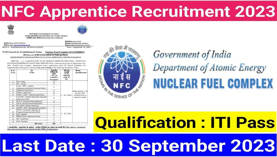 न्यूक्लियर फ्यूल कॉम्प्लेक्स (NFC) ने विभिन्न विषयों के लिए 206 अपरेंटिस पदों के लिए भर्ती अधिसूचना जारी की है। यह भर्ती अधिसूचना बताती है कि कुल 206 अपरेंटिस की भर्ती की जाएगी। इस अधिसूचना के तहत उम्मीदवार 30 सितंबर 2023 से पहले ऑनलाइन आवेदन कर सकते हैं। नीचे दिए गए NFC अपरेंटिस भर्ती 2023 के बारे में सभी जानकारी जैसे पात्रता, आयु सीमा, और अन्य विवरण देखें।