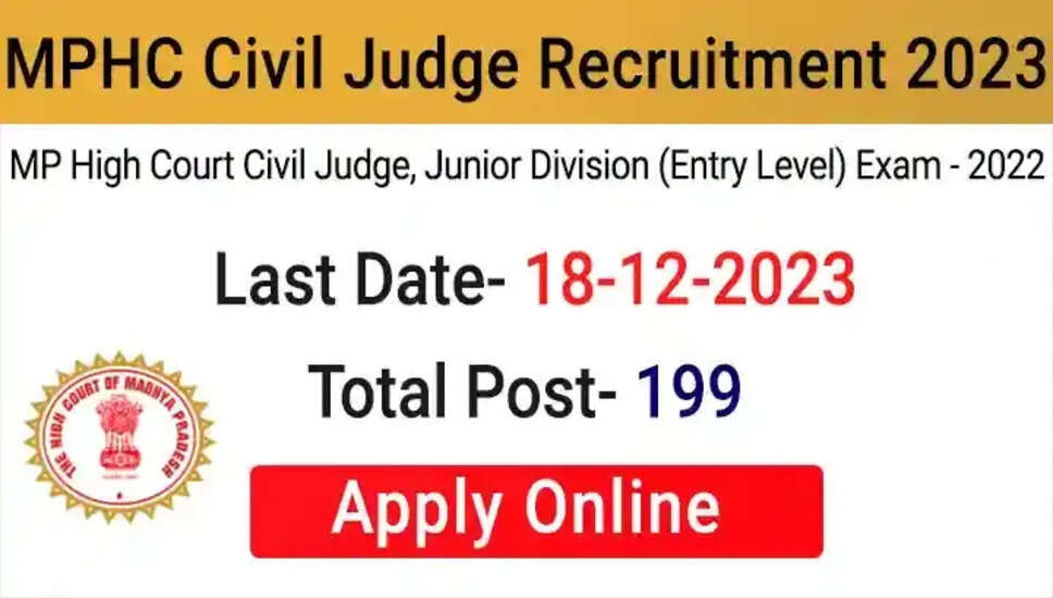 मध्य प्रदेश उच्च न्यायालय (एमपीएचसी) ने 2023 में सिविल जजों की भर्ती के लिए एक ऑनलाइन फॉर्म जारी किया है। इस अवसर में 2024 के लिए निर्धारित परीक्षा के माध्यम से वर्तमान और बैकलॉग दोनों रिक्तियां शामिल हैं। इच्छुक उम्मीदवार 17 नवंबर, 2023 से दिसंबर तक ऑनलाइन आवेदन कर सकते हैं। 18, 2023. आवेदन करने से पहले, भर्ती विवरण, वेतनमान, आयु सीमा, चयन प्रक्रिया और नौकरी की जानकारी के लिए विज्ञापन की गहन समीक्षा करने की सलाह दी जाती है।