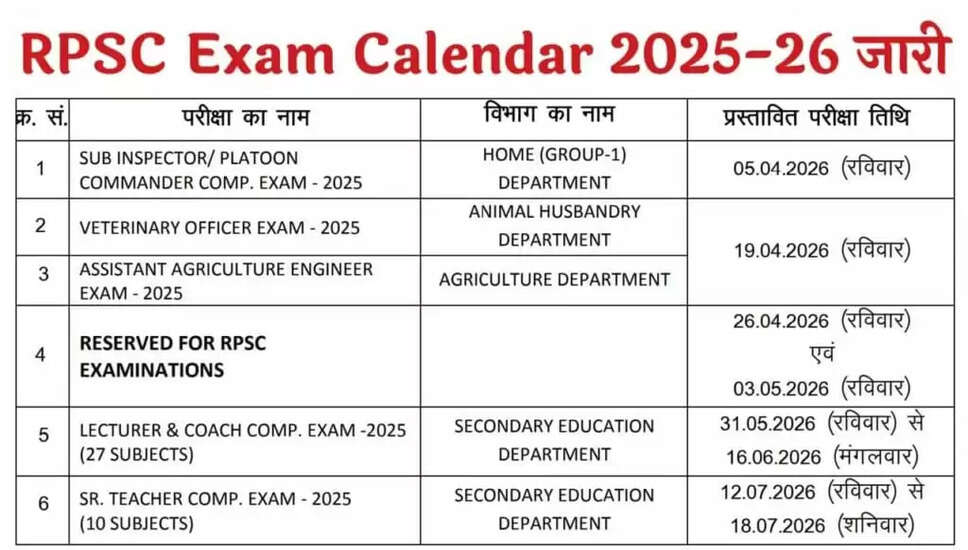 आरपीएससी सीनियर टीचर भर्ती परीक्षा 7 से 12 सितंबर 2025 तक होगी। सहायक मत्स्य विकास अधिकारी की परीक्षा 29 जुलाई को होगी। अन्य सभी भर्ती परीक्षाओं की तिथियाँ भी परीक्षा कैलेंडर में देखी जा सकती हैं।