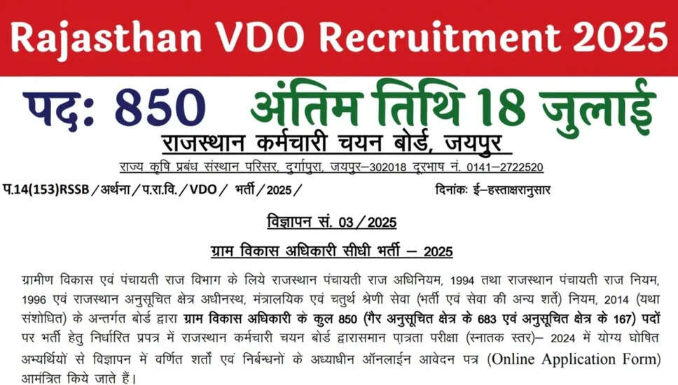 राजस्थान कर्मचारी चयन बोर्ड ने ग्राम विकास अधिकारी के 850 पदों के लिए भर्ती का नोटिफिकेशन जारी किया है। योग्य उम्मीदवार एसएसओ पोर्टल पर ऑनलाइन आवेदन कर सकते हैं। आवेदन की प्रक्रिया 19 जून से शुरू होकर 18 जुलाई 2025 तक चलेगी, जबकि परीक्षा 31 अगस्त 2025 को आयोजित की जाएगी।