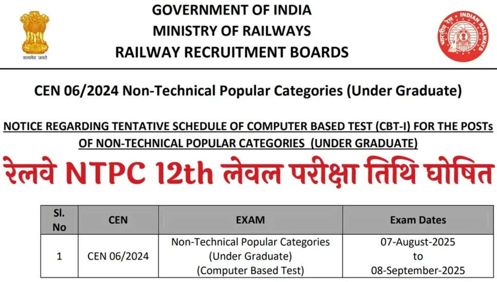 रेलवे एनटीपीसी 12वीं स्तर परीक्षा तिथि 2025 की घोषणा