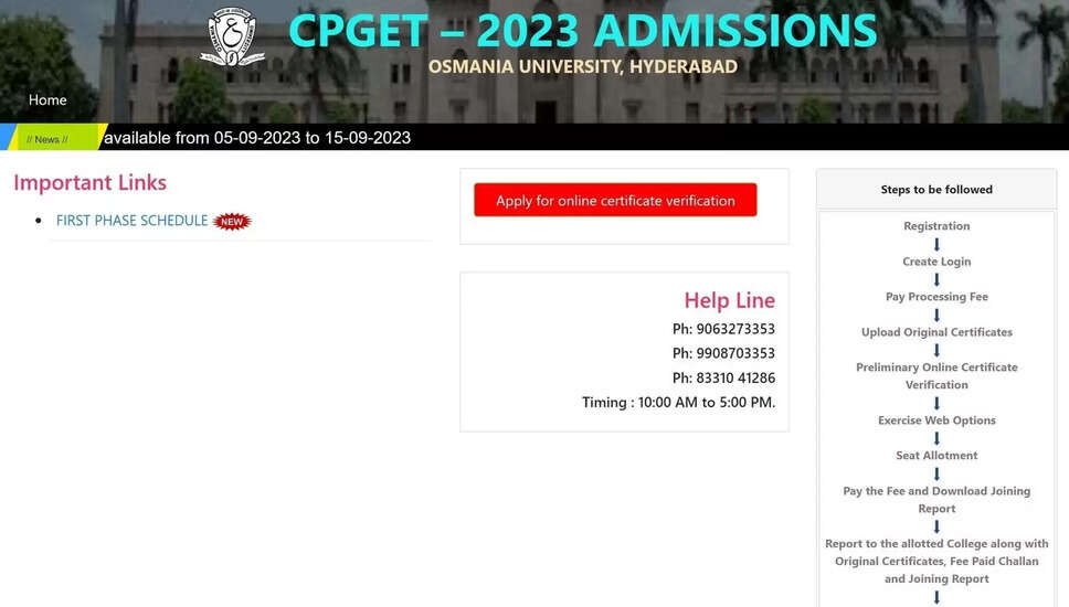 ओस्मानिया विश्वविद्यालय CPGET 2023 काउंसलिंग के लिए दूसरा चरण वेब विकल्प प्रवेश को शुरू कर रहा है, यह पात्र उम्मीदवारों के लिए एक और मौका प्रदान करता है। पिछले चरण में अपलोड की गई प्रमाण पत्रों का सत्यापन आज ही के रूप में समाप्त हो जाता है, जैसा कि अनुसूची के अनुसार है। यह दूसरा चरण काउंसलिंग प्रक्रिया CPGET 2023 को स्वीकार करने वाले आवेदकों को उनके पसंदीदा पाठ्यक्रम और कॉलेज चुनने की अनुमति देती है। अगर आप उनमें से एक हैं, तो वेब विकल्प प्रवेश में भाग लेने के लिए निम्नलिखित चरणों का पालन करें।