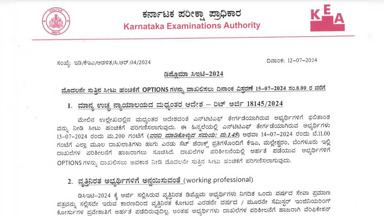 कर्नाटक परीक्षा प्राधिकरण (केईए) ने कर्नाटक डिप्लोमा सीईटी (डीसीईटी) 2024 के लिए वेब विकल्प दर्ज करने की समय सीमा बढ़ा दी है। नेशनल एप्टीट्यूड टेस्ट इन आर्किटेक्चर (एनएटीए) में उत्तीर्ण और पेशेवर डिप्लोमा धारकों सहित पात्र उम्मीदवार अब 18 जुलाई, 2024 को दोपहर 2 बजे तक केईए की आधिकारिक वेबसाइट kea.kar.nic.in के माध्यम से कॉलेजों और पाठ्यक्रमों की अपनी पसंद जमा कर सकते हैं ।