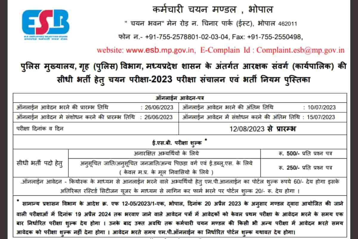 मध्य प्रदेश कर्मचारी चयन बोर्ड (MPESB) ने जनरल ड्यूटी, विशेष सशस्त्र बल और रेडियो ऑपरेटर पदों पर पुलिस कांस्टेबल की भर्ती के लिए अधिसूचना जारी की है। जिन उम्मीदवारों ने आवेदन किया है और CBT परीक्षा में शामिल हुए हैं, वे अब PET परीक्षा शेड्यूल डाउनलोड कर सकते हैं। नीचे मुख्य विवरण दिए गए हैं: