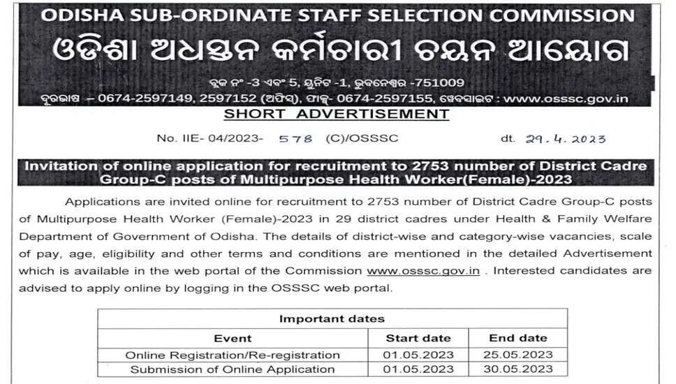 ओडिशा अधीनस्थ कर्मचारी चयन आयोग (ओएसएसएससी) ने वर्ष 2023 के लिए बहुउद्देश्यीय स्वास्थ्य कार्यकर्ता (महिला) की भर्ती के लिए अधिसूचना जारी की है। इस रिक्ति में रुचि रखने वाले उम्मीदवारों को अधिसूचना पढ़ने और ऑनलाइन आवेदन करने के लिए प्रोत्साहित किया जाता है।