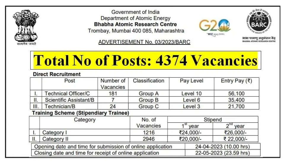 भाभा परमाणु अनुसंधान केंद्र (BARC) तकनीशियन/B, तकनीकी अधिकारी, वैज्ञानिक सहायक, स्टाइपेंडियरी ट्रेनी भर्ती 2023 के लिए उम्मीदवार 24 अप्रैल 2023 से 22 मई 2023 के बीच आवेदन कर सकते हैं।