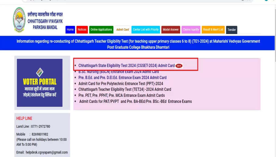 छत्तीसगढ़ व्यावसायिक परीक्षा मंडल (CGPEB), जिसे आमतौर पर CG व्यापम के नाम से जाना जाता है, ने छत्तीसगढ़ राज्य पात्रता परीक्षा (CGSET-2024) के लिए अधिसूचना जारी कर दी है। इच्छुक उम्मीदवार जो पात्रता मानदंडों को पूरा करते हैं, वे पूरी अधिसूचना पढ़ सकते हैं और ऑनलाइन आवेदन कर सकते हैं। नीचे विवरण दिया गया है: