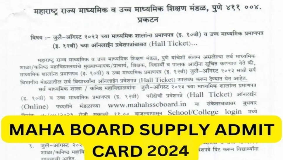 महाराष्ट्र स्टेट बोर्ड ऑफ सेकेंडरी एंड हायर सेकेंडरी एजुकेशन (MSBSHSE) जल्द ही हायर सेकेंडरी सर्टिफिकेट (HSC) परीक्षा 2024 के हॉल टिकट जारी करने जा रहा है। जूनियर कॉलेज हॉल टिकट डाउनलोड करने के लिए आधिकारिक वेबसाइट mahahsscboard.in पर लॉग इन कर सकते हैं । कॉलेज प्राचार्यों की मुहर लगे ये हॉल टिकट 12वीं कक्षा के छात्रों को बिना किसी शुल्क के वितरित किए जाएंगे।