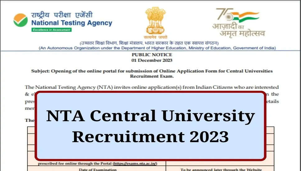 राष्ट्रीय परीक्षण एजेंसी (एनटीए) ने संयुक्त केंद्रीय विश्वविद्यालय भर्ती (सीयूआरईसी) 2023 परीक्षा में ग्रुप ए, ग्रुप बी और ग्रुप सी के विभिन्न पदों के लिए एक भर्ती अधिसूचना जारी की है। इच्छुक उम्मीदवार जो पात्रता मानदंडों को पूरा करते हैं वे ऑनलाइन आवेदन कर सकते हैं। यहाँ विवरण हैं: