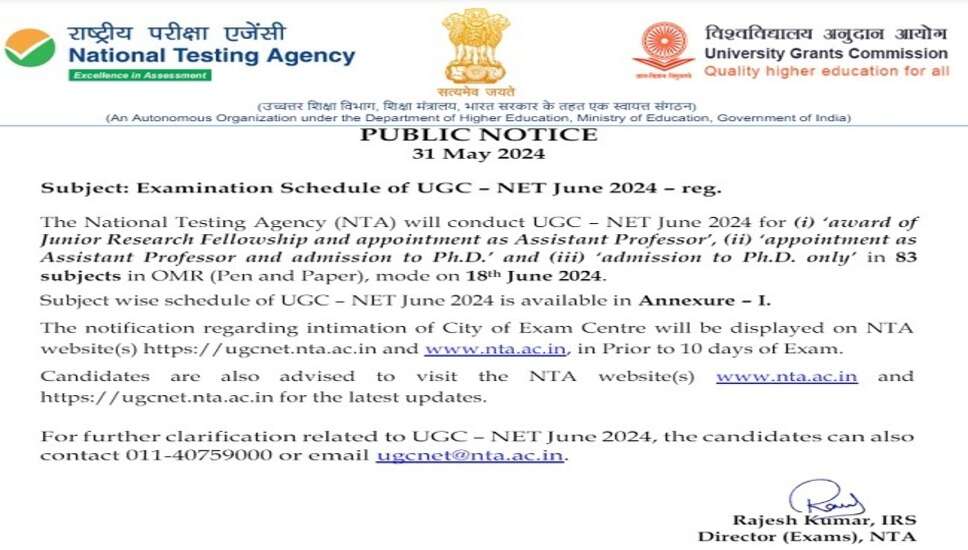 नेशनल टेस्टिंग एजेंसी (NTA) ने UGC NET/JRF परीक्षा जून 2024 के लिए अधिसूचना जारी कर दी है। इस परीक्षा में शामिल होने के इच्छुक उम्मीदवार एडमिट कार्ड डाउनलोड कर सकते हैं और परीक्षा शहर की जांच कर सकते हैं। नीचे महत्वपूर्ण विवरण दिए गए हैं: