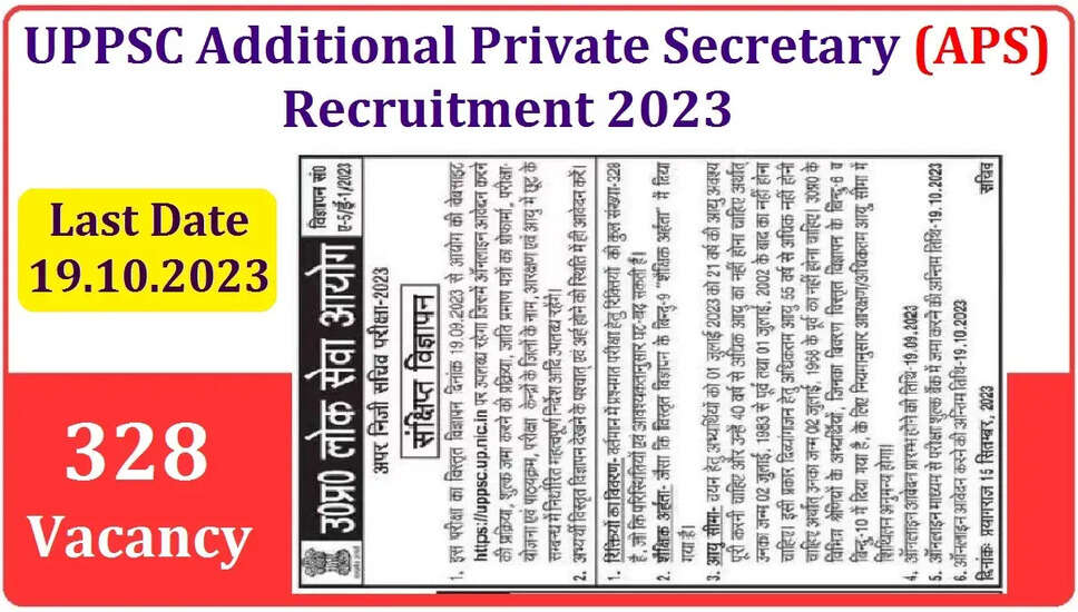 उत्तर प्रदेश लोक सेवा आयोग (यूपीपीएससी) ने अतिरिक्त निजी सचिव रिक्ति (एपीएस) की भर्ती के लिए एक अधिसूचना जारी की है। रिक्ति के इच्छुक और पात्रता मानदंडों को पूरा करने वाले उम्मीदवार अधिसूचना विवरण की पूरी तरह से समीक्षा कर सकते हैं और ऑनलाइन आवेदन प्रक्रिया के साथ आगे बढ़ सकते हैं।