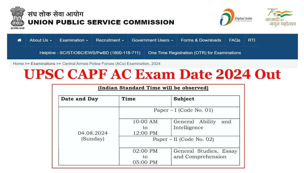 UPSC CAPF (ACs) परीक्षा तिथि 2024 - परीक्षा समय सारणी जारी