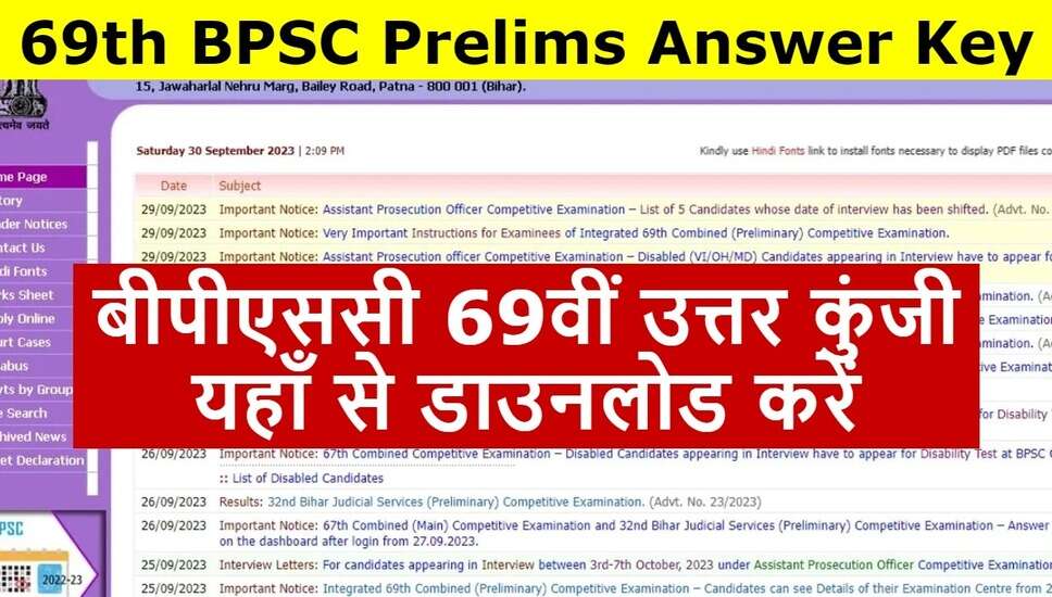 बिहार लोक सेवा आयोग (BPSC) ने संयुक्त 69वीं प्रारंभिक परीक्षा का आयोजन किया है और इस परीक्षा की प्रोविजनल उत्तर-कुंजी जल्द ही जारी करने का काम शुरू करेगा। परीक्षा बिहार के विभिन्न केंद्रों पर दोपहर 12 बजे से 2 बजे तक आयोजित की गई थी। उम्मीदवारों को सलाह दी जाती है कि वे बीपीएससी की आधिकारिक वेबसाइट https://www.bpsc.bih.nic.in/ पर नियमित रूप से जांचते रहें, ताकि उन्हें उत्तर-कुंजी के रिलीज के बारे में सूचना मिल सके। उत्तर-कुंजी जारी होने पर, उम्मीदवार इसे पीडीएफ फॉर्मेट में डाउनलोड कर सकेंगे। नीचे दिए गए सरल स्टेप्स का पालन करके उम्मीदवार उत्तर-कुंजी को डाउनलोड कर सकेंगे।