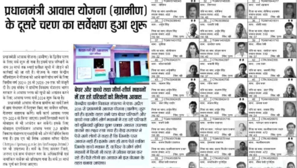 भारत सरकार द्वारा प्रधानमंत्री आवास योजना के तहत नागरिकों को स्थायी घरों के निर्माण के लिए वित्तीय सहायता दी जा रही है। जिन नागरिकों ने इस योजना के लिए सर्वेक्षण नहीं कराया है, उन्हें सर्वे से जुड़ी जानकारी प्राप्त करनी चाहिए और निर्धारित समय पर सर्वे प्रक्रिया को पूरा करना चाहिए। इससे उन्हें पक्के घर के निर्माण के लिए आवश्यक राशि प्राप्त होगी।