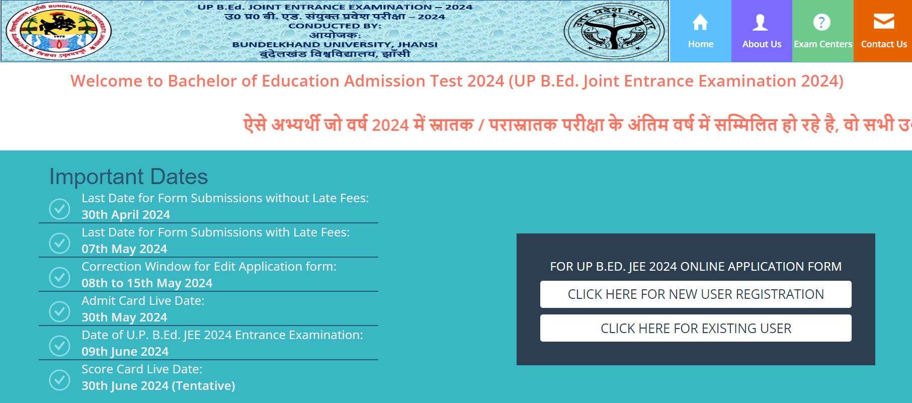बुंदेलखंड विश्वविद्यालय, झांसी ने उत्तर प्रदेश के राज्य विश्वविद्यालयों में बी.एड. पाठ्यक्रम करने के इच्छुक उम्मीदवारों के लिए उत्तर प्रदेश संयुक्त प्रवेश परीक्षा यूपी बीएड 2024 अधिसूचना की घोषणा की है। यहाँ UPBED 2024 प्रवेश के बारे में विस्तृत जानकारी दी गई है, जिसमें महत्वपूर्ण तिथियाँ, पात्रता मानदंड और आवेदन प्रक्रिया शामिल है।