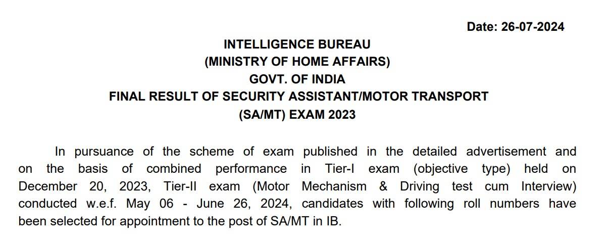IB सुरक्षा सहायक/मोटर ट्रांसपोर्ट परिणाम 2024 – अंतिम परिणाम घोषित