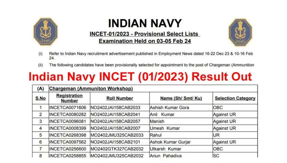 भारतीय नौसेना ने INCET-01/2023 परीक्षा परिणाम 2024 जारी किया