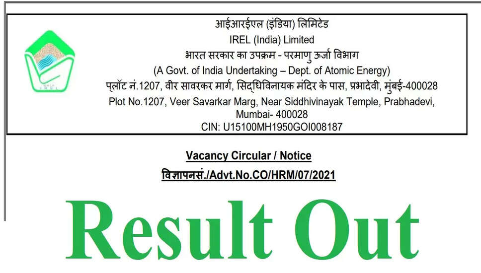 IREL (India) Ltd ने विभिन्न रिक्तियों के लिए पर्याप्त चयनित उम्मीदवारों की सूची जारी की, अभी डाउनलोड करें