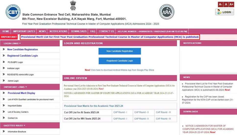 स्टेट कॉमन एंट्रेंस टेस्ट सेल (CET सेल) महाराष्ट्र ने महाराष्ट्र कॉमन एंट्रेंस टेस्ट (MAH MCA) 2024 के लिए प्रारंभिक मेरिट सूची जारी कर दी है। जिन उम्मीदवारों ने MAH MCA PET काउंसलिंग के लिए पंजीकरण कराया था, वे अब आधिकारिक वेबसाइट mca2024.mahacet.org.in पर प्रोविजनल मेरिट सूची देख सकते हैं । मेरिट सूची पीडीएफ प्रारूप में उपलब्ध है, और इसे देखने के लिए किसी लॉगिन क्रेडेंशियल की आवश्यकता नहीं है।
