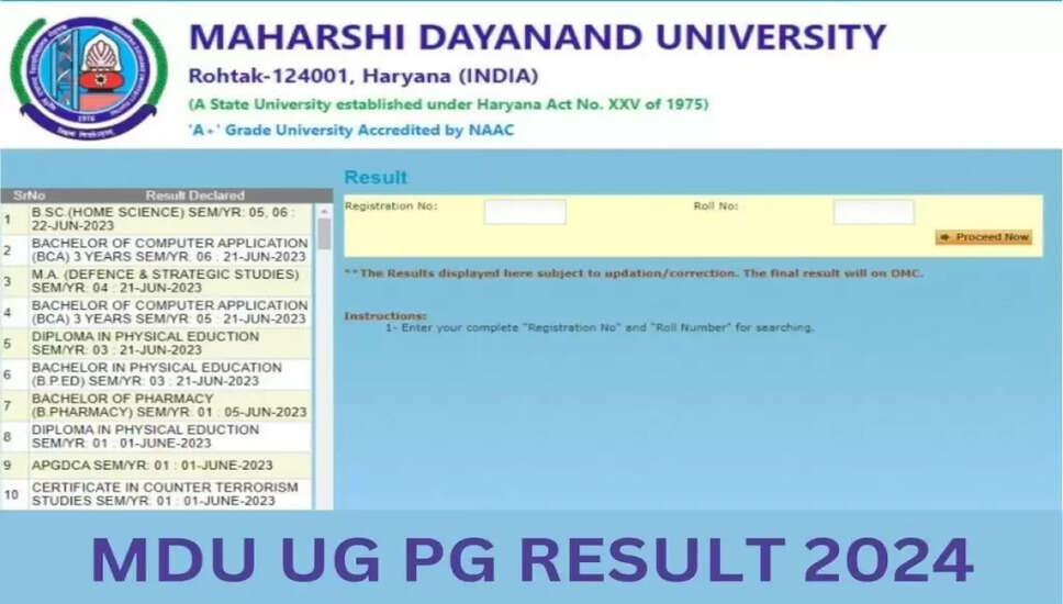 महर्षि दयानंद विश्वविद्यालय (एमडीयू), जो पहले रोहतक विश्वविद्यालय था, ने बीसीए, बीए, बीएससी, पीएचडी कोर्स वर्क, एमएससी, बीपीएड और अन्य सहित विभिन्न पाठ्यक्रमों के परिणामों की घोषणा की है। छात्र अपने पंजीकरण नंबर और रोल नंबर का उपयोग करके आधिकारिक वेबसाइट पर अपना परिणाम देख सकते हैं।