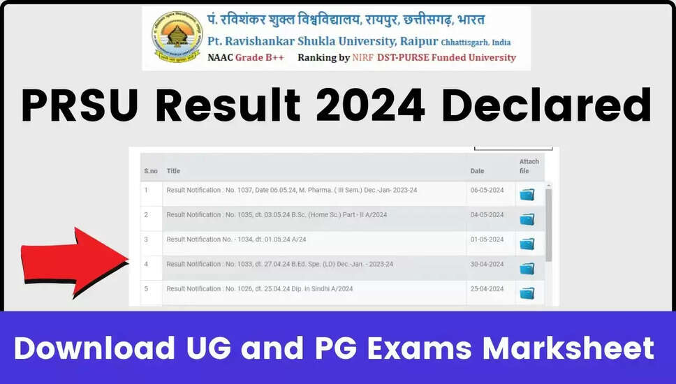 पं. रविशंकर शुक्ल विश्वविद्यालय (PRSU) ने हाल ही में BA, BCom, BSc, MA, MCom, MSc और अन्य परीक्षाओं सहित विभिन्न पाठ्यक्रमों के सेमेस्टर परिणामों की घोषणा की है। PRSU परिणाम 2024 अब आधिकारिक वेबसाइट prsu.ac.in पर ऑनलाइन उपलब्ध है। मार्च-अप्रैल 2024 में आयोजित वार्षिक परीक्षाओं के लिए उपस्थित होने वाले छात्र अब नीचे दिए गए सीधे लिंक का उपयोग करके अपने परिणाम देख और डाउनलोड कर सकते हैं। PRSU परिणाम 2024 PDF तक पहुँचने के लिए, छात्रों को अपने रोल नंबर के साथ लॉग इन करना होगा।