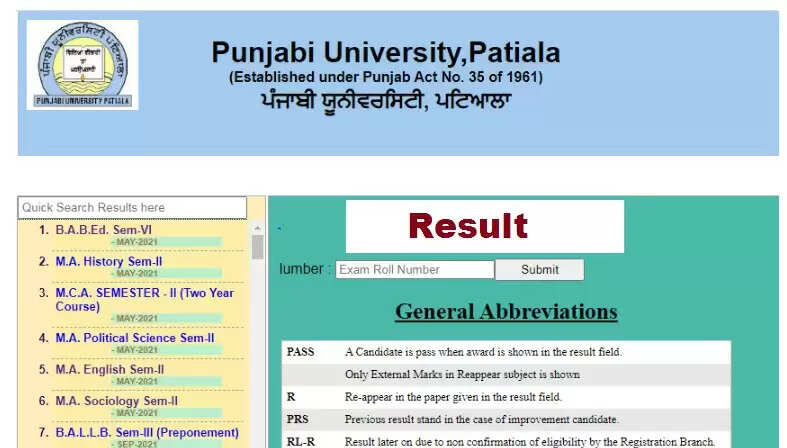पंजाबी यूनिवर्सिटी पटियाला (PUP) ने BSc, BLib, BA, MA, MSc, BA LLB और अन्य सहित विभिन्न पाठ्यक्रमों के परिणामों की घोषणा की है। परिणाम अब आधिकारिक वेबसाइट - punjabiuniversity.ac.in पर ऑनलाइन उपलब्ध हैं । छात्र अपने रोल नंबर का उपयोग करके अपने परिणाम देख सकते हैं।