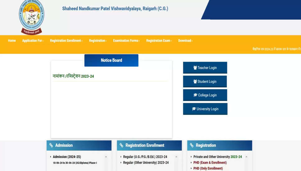 शहीद नंदकुमार पटेल विश्वविद्यालय (एसएनपीवी) ने वर्ष 2024 के लिए बीए एलएलबी, एमए, एमएससी, एमकॉम, एमएसडब्ल्यू, एमएड और एलएलबी सहित विभिन्न पाठ्यक्रमों के पहले और तीसरे सेमेस्टर के परिणामों की घोषणा कर दी है। छात्र आधिकारिक वेबसाइट के माध्यम से अपने परिणाम ऑनलाइन देख सकते हैं।