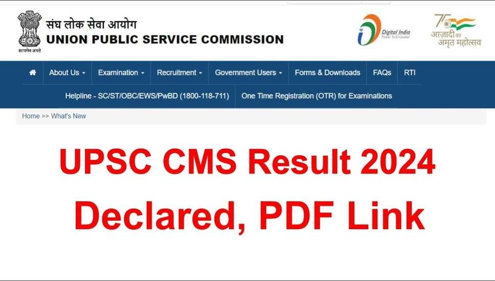संघ लोक सेवा आयोग (UPSC) ने संयुक्त चिकित्सा सेवा (CMS) परीक्षा 2024 के परिणाम घोषित कर दिए हैं। परीक्षा में शामिल होने वाले उम्मीदवार अब अपने परिणाम डाउनलोड कर सकते हैं। भर्ती प्रक्रिया, महत्वपूर्ण तिथियां, पात्रता मानदंड और आवेदन कैसे करें, इसके बारे में नीचे विवरण दिया गया है।