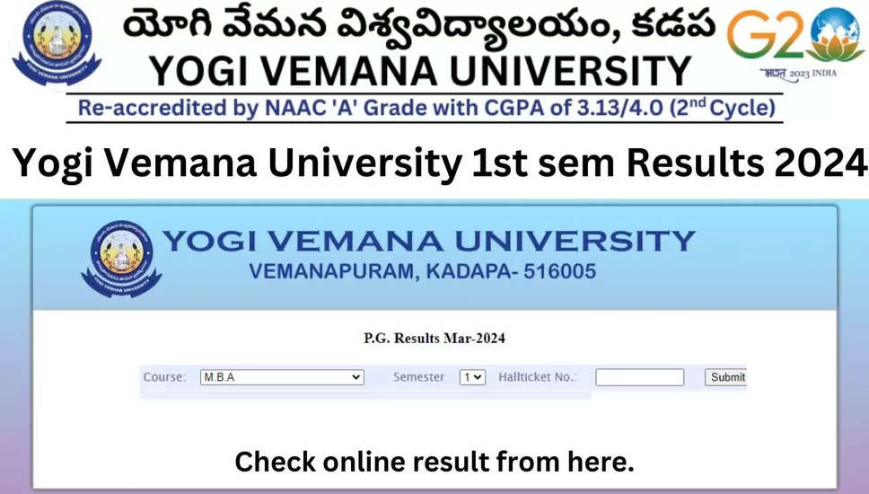योगी वेमना विश्वविद्यालय ने बीए, बीएससी, बीकॉम, बीएड, एमएड और अन्य सहित विभिन्न पाठ्यक्रमों के परिणामों की घोषणा की है। छात्र अपने परिणाम ऑनलाइन देख सकते हैं।