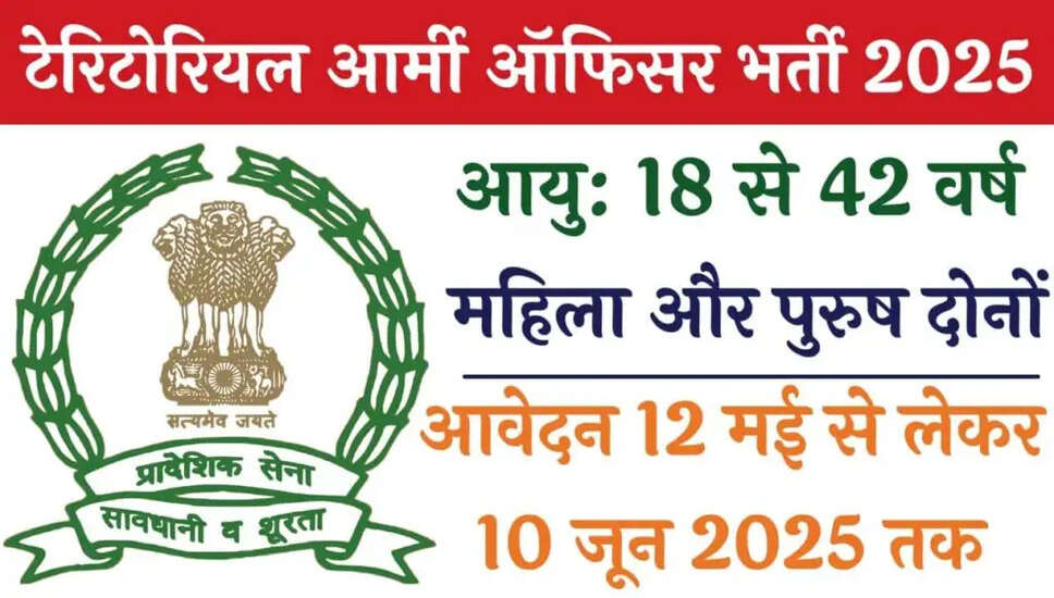 टेरिटोरियल आर्मी ऑफिसर भर्ती 2025 के लिए आवेदन 12 मई से शुरू होकर 10 जून 2025 तक भरे जाएंगे। अभ्यर्थी विस्तृत जानकारी आधिकारिक नोटिफिकेशन से प्राप्त कर सकते हैं।