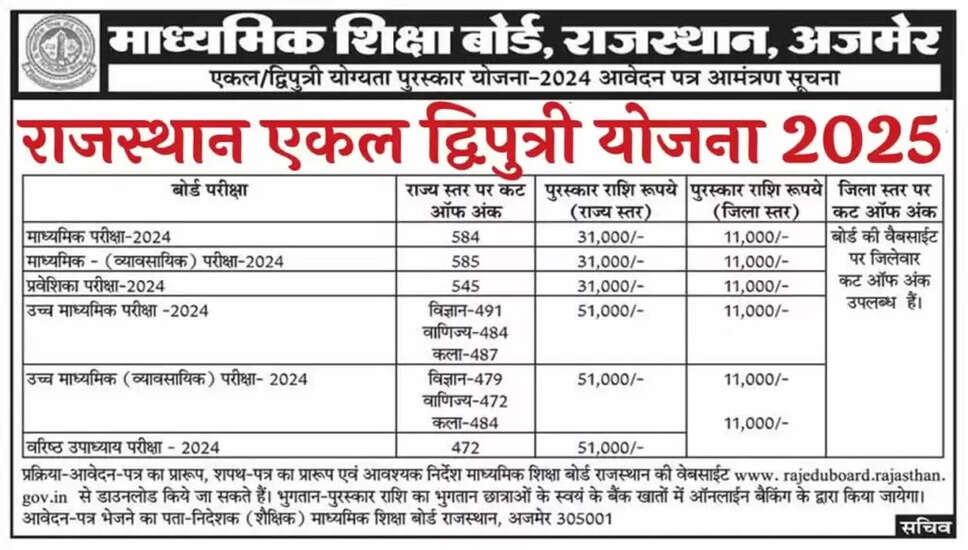 राजस्थान राज्य ने एकल द्विपुत्री योजना 2024-25 के लिए अधिसूचना जारी की है। इस योजना के तहत, 10वीं और 12वीं कक्षा के छात्र, जिन्होंने 2024 की परीक्षा में निर्धारित कट ऑफ अंक या उससे अधिक अंक प्राप्त किए हैं, आवेदन कर सकते हैं। यह योजना उन परिवारों के लिए है जिनकी एकमात्र संतान है या जिनके पास दो या तीन पुत्रियाँ हैं, जिनमें से एक के बाद दो जुड़वां पुत्रियाँ हैं। आवेदन की अंतिम तिथि 30 मई 2025 निर्धारित की गई है।