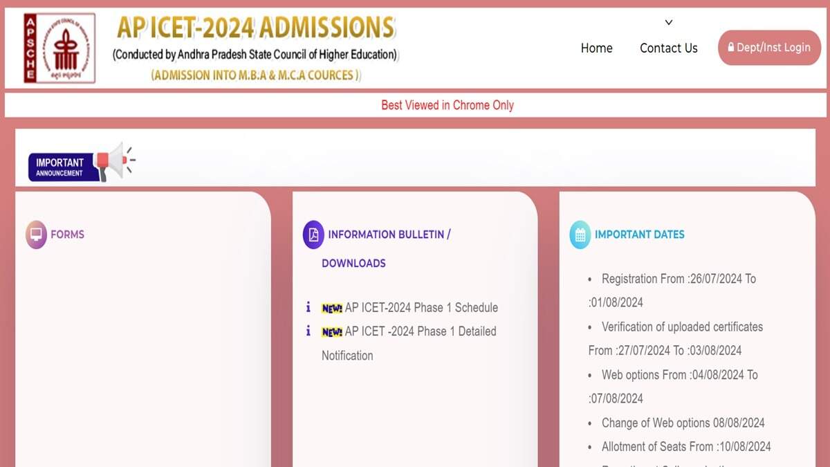 आधिकारिक एपी आईसीईटी काउंसलिंग वेबसाइट पर जाएं: अपनी पंजीकरण प्रक्रिया शुरू करने के लिए icet-sche.aptonline.in पर जाएं ।