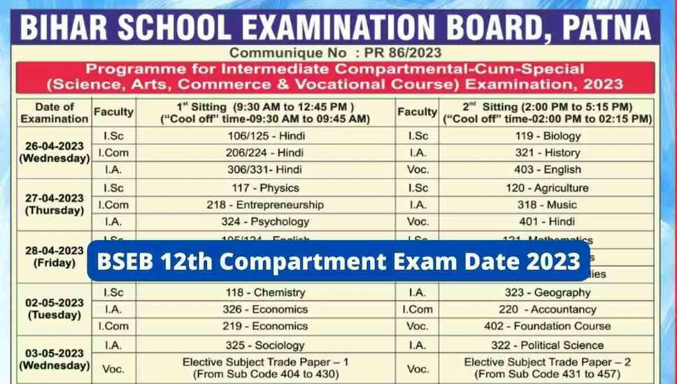 बिहार विद्यालय परीक्षा समिति (Bihar School Examination Board - BSEB) द्वारा कक्षा 12 के छात्रों के लिए कंपार्टमेंटल परीक्षा आयोजित की जा रही है। इस परीक्षा में छात्रों को दो शिफ्ट में बाँटा गया है। पहली शिफ्ट सुबह 9:30 बजे से 12:45 बजे तक और दूसरी शिफ्ट दोपहर 2:00 बजे से 5:15 बजे तक होगी।