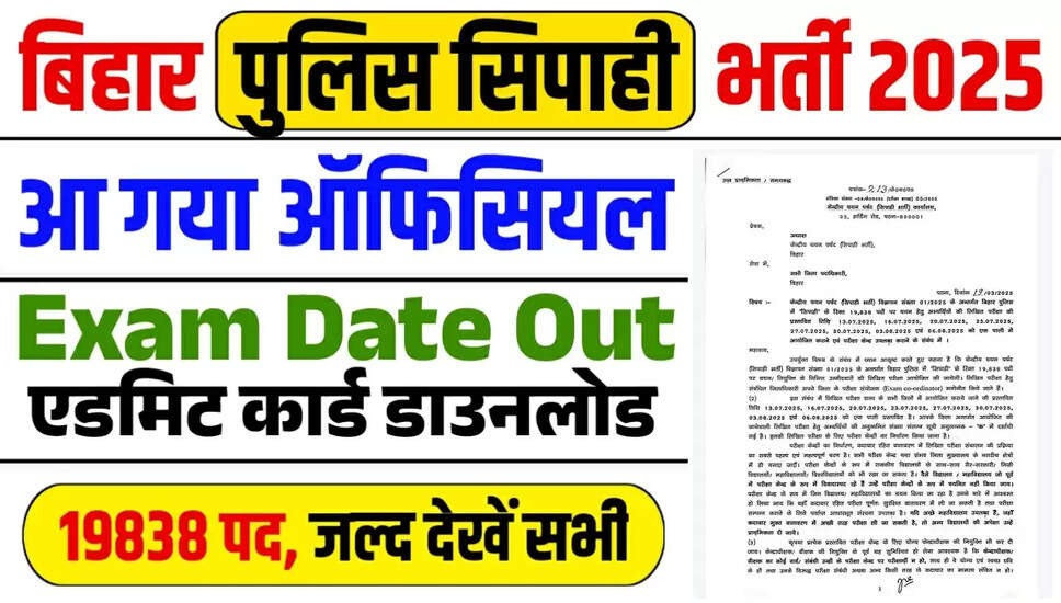 महत्वपूर्ण जानकारी: केंद्रीय चयन बोर्ड (CSBC) ने कांस्टेबल पद के लिए परीक्षा कार्यक्रम और प्रवेश पत्र की तिथि जारी की है। इस भर्ती में कुल 19,838 पदों के लिए आवेदन आमंत्रित किए गए थे। बिहार पुलिस CSBC कांस्टेबल भर्ती 2025 के लिए आवेदन 18 मार्च 2025 से 17 जनवरी 2025 तक स्वीकार किए गए। लिखित परीक्षा 16, 20, 23, 27, 30 जुलाई और 03 अगस्त 2025 को आयोजित की जाएगी। जो उम्मीदवार इस फॉर्म के लिए आवेदन कर चुके हैं, वे नीचे दिए गए लिंक से अपने बिहार पुलिस CSBC कांस्टेबल परीक्षा कार्यक्रम/ प्रवेश पत्र की तिथि 2025 डाउनलोड कर सकते हैं।
