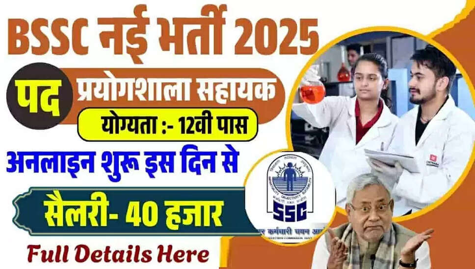 महत्वपूर्ण जानकारी: बिहार कर्मचारी चयन आयोग (BSSC) ने प्रयोगशाला सहायक के पद के लिए अधिसूचना जारी की है। इस भर्ती में कुल 143 पदों के लिए आवेदन आमंत्रित किए गए हैं। BSSC प्रयोगशाला सहायक भर्ती 2025 के लिए ऑनलाइन आवेदन प्रक्रिया 15 मई 2025 से शुरू होगी और उम्मीदवार 14 जून 2025 तक आवेदन कर सकते हैं। उम्मीदवारों को BSSC प्रयोगशाला सहायक भर्ती 2025 के लिए सभी विवरण नीचे दिए गए अनुसार देखना चाहिए।