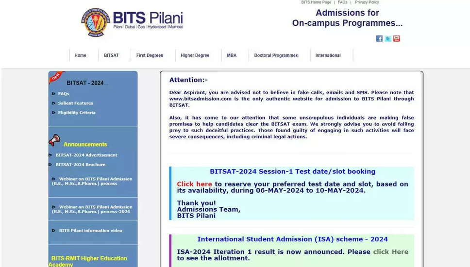 संशोधित बिट्स 2024 प्रत्यक्ष प्रवेश तिथियां: