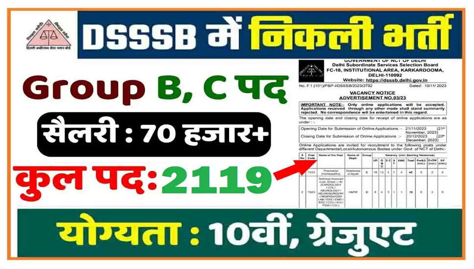 महत्वपूर्ण जानकारी: दिल्ली अधीनस्थ सेवा चयन बोर्ड (DSSSB) ने विभिन्न ग्रुप B और C पदों के लिए भर्ती अधिसूचना जारी की है। इस भर्ती में कुल 2119 पदों के लिए आवेदन आमंत्रित किए गए हैं। DSSSB ग्रुप B, C विभिन्न पदों की भर्ती के लिए ऑनलाइन आवेदन प्रक्रिया 08 जुलाई 2025 से शुरू होगी और उम्मीदवार 07 अगस्त 2025 तक आवेदन कर सकते हैं। उम्मीदवारों को DSSSB ग्रुप B, C विभिन्न पदों की भर्ती से संबंधित सभी जानकारी नीचे दी गई है।