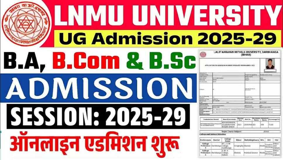 महत्वपूर्ण जानकारी: लालित नारायण मिथिला विश्वविद्यालय (LNMU) ने 2025-29 शैक्षणिक सत्र के लिए स्नातक पाठ्यक्रम (B.A, B.Com, B.Sc) के लिए ऑनलाइन आवेदन आमंत्रित किए हैं। यह चार वर्षीय कार्यक्रम विकल्प आधारित क्रेडिट प्रणाली (CBCS) के तहत है। ऑनलाइन पंजीकरण प्रक्रिया 01 मई 2025 से शुरू हो चुकी है और आवेदन की अंतिम तिथि 24 मई 2025 है। उम्मीदवारों को LNMU UG ऑनलाइन फॉर्म 2025 के लिए सभी विवरणों की जांच करनी चाहिए।