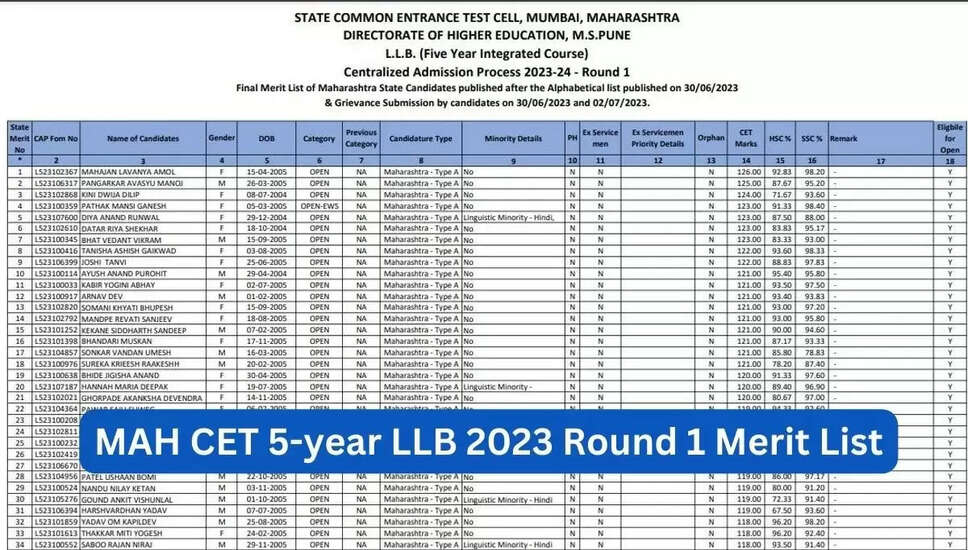 कॉमन एंट्रेंस सेल महाराष्ट्र कल, 19 जुलाई, 2024 को MH CET लॉ 2024 5-वर्षीय LLB राउंड I मेरिट लिस्ट जारी करेगा। यह मेरिट लिस्ट आधिकारिक MAH CET सेल वेबसाइट - cetcell.mahacet.org/2024-2025 पर उपलब्ध होगी। इसमें MAH CET LLB 2024 सेंट्रलाइज्ड एडमिशन प्रोसेस (CAP) के पहले राउंड के माध्यम से 5-वर्षीय LLB कार्यक्रमों में प्रवेश के लिए पात्र उम्मीदवारों के नाम, रोल नंबर और अन्य विवरण शामिल होंगे।