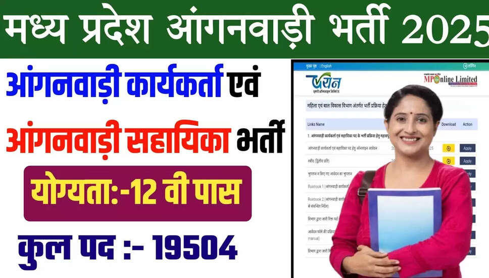 महिला एवं बाल विकास विभाग, मध्य प्रदेश ने आंगनवाड़ी कार्यकर्ता और सहायक पदों के लिए आधिकारिक अधिसूचना जारी की है। इस भर्ती में कुल 19503 पदों के लिए आवेदन आमंत्रित किए गए हैं। ऑनलाइन आवेदन प्रक्रिया 20 जून 2025 से शुरू हो चुकी है और उम्मीदवार 04 जुलाई 2025 तक आवेदन कर सकते हैं। इच्छुक और योग्य उम्मीदवारों के लिए भर्ती से संबंधित सभी जानकारी नीचे दी गई है।