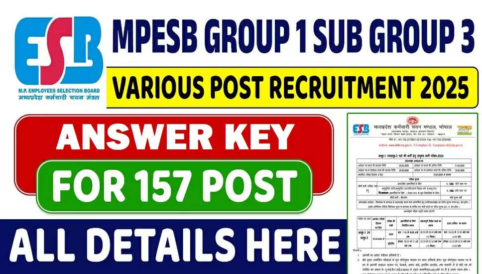 मध्य प्रदेश कर्मचारी चयन बोर्ड (MPESB) ने ग्रुप 1 सब ग्रुप 3 के विभिन्न पदों के लिए उत्तर कुंजी जारी कर दी है। इस भर्ती में 157 पद शामिल हैं, और आवेदन प्रक्रिया 25 फरवरी से 11 मार्च 2025 तक चली। परीक्षा 15 मई 2025 को आयोजित की गई थी। उम्मीदवार अब अपनी उत्तर कुंजी डाउनलोड कर सकते हैं। इस लेख में महत्वपूर्ण तिथियाँ, आवेदन शुल्क, उम्र सीमा, रिक्तियों का विवरण और शैक्षणिक योग्यता के बारे में जानकारी दी गई है।