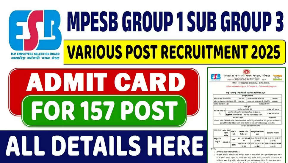 मध्य प्रदेश कर्मचारी चयन बोर्ड (MPESB) ने ग्रुप 1 सब ग्रुप 3 के विभिन्न पदों के लिए एडमिट कार्ड जारी कर दिए हैं। इस भर्ती में कुल 157 पदों के लिए आवेदन आमंत्रित किए गए थे। आवेदन प्रक्रिया 25 फरवरी 2025 से शुरू होकर 11 मार्च 2025 तक चली। लिखित परीक्षा 15 मई 2025 को आयोजित की जाएगी। जिन उम्मीदवारों ने आवेदन किया है, वे नीचे दिए गए लिंक से अपना एडमिट कार्ड डाउनलोड कर सकते हैं।