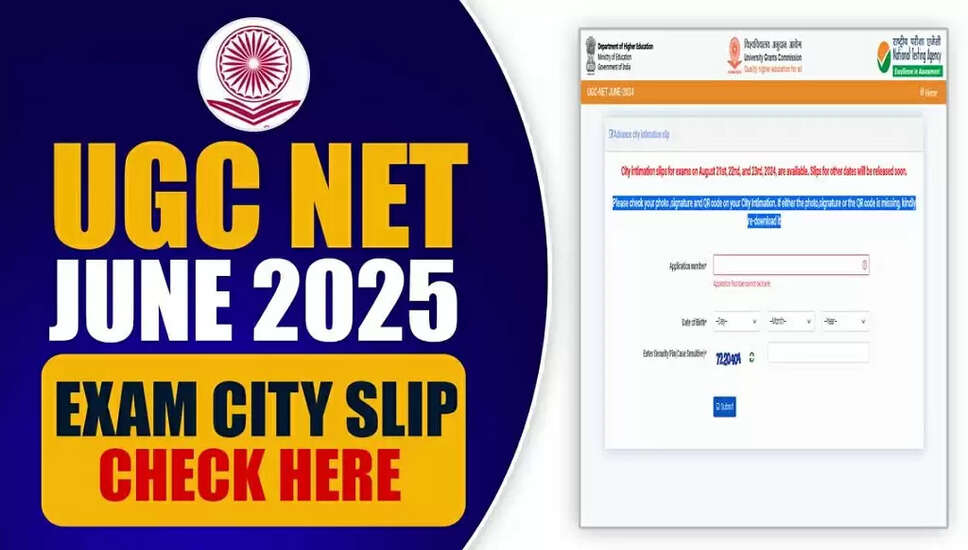 महत्वपूर्ण जानकारी: राष्ट्रीय परीक्षण एजेंसी (NTA) ने विश्वविद्यालय अनुदान आयोग UGC राष्ट्रीय पात्रता परीक्षा NET सहायक प्रोफेसर / JRF जून 2025 परीक्षा के लिए शहर स्लिप जारी की है।