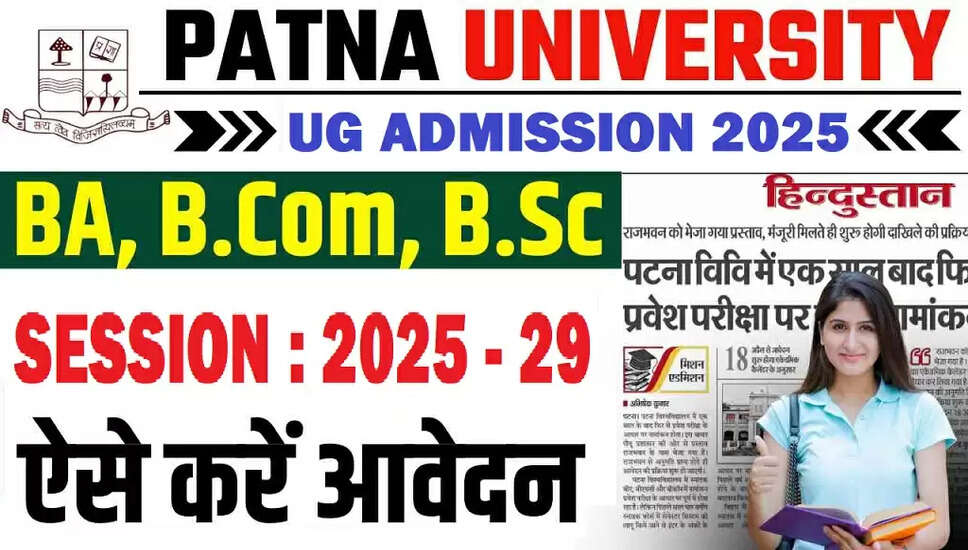 महत्वपूर्ण जानकारी: Patna University ने नियमित अंडरग्रेजुएट (UG) / स्नातक / डिग्री पाठ्यक्रम (B.A / B.Sc / B.Com) के लिए ऑनलाइन आवेदन आमंत्रित किए हैं। यह शैक्षणिक सत्र 2025-29 के लिए चार वर्षीय कार्यक्रम है जो विकल्प आधारित क्रेडिट प्रणाली (CBCS) के तहत है। Patna University UG Online Form 2025 के लिए ऑनलाइन पंजीकरण प्रक्रिया 24 अप्रैल 2025 से शुरू हो गई है। आवेदन करने की अंतिम तिथि 31 मई 2025 है। उम्मीदवारों को Patna University UG Online Form 2025 के लिए सभी विवरणों की जांच करनी चाहिए।