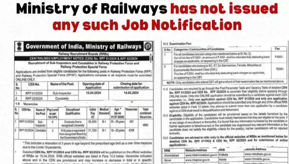 पीआईबी द्वारा स्पष्टीकरण: वायरल नोटिस में दावा किया गया है कि रेलवे भर्ती बोर्ड (आरआरबी) ने आरपीएफ कांस्टेबल और सब-इंस्पेक्टर के लिए 4660 रिक्तियों की घोषणा की है। हालाँकि, पीआईबी ने स्पष्ट किया कि रेल मंत्रालय द्वारा ऐसा कोई नोटिस जारी नहीं किया गया था। जनता से सोशल मीडिया पर फैली गलत सूचनाओं से सावधान रहने का आग्रह किया जाता है।