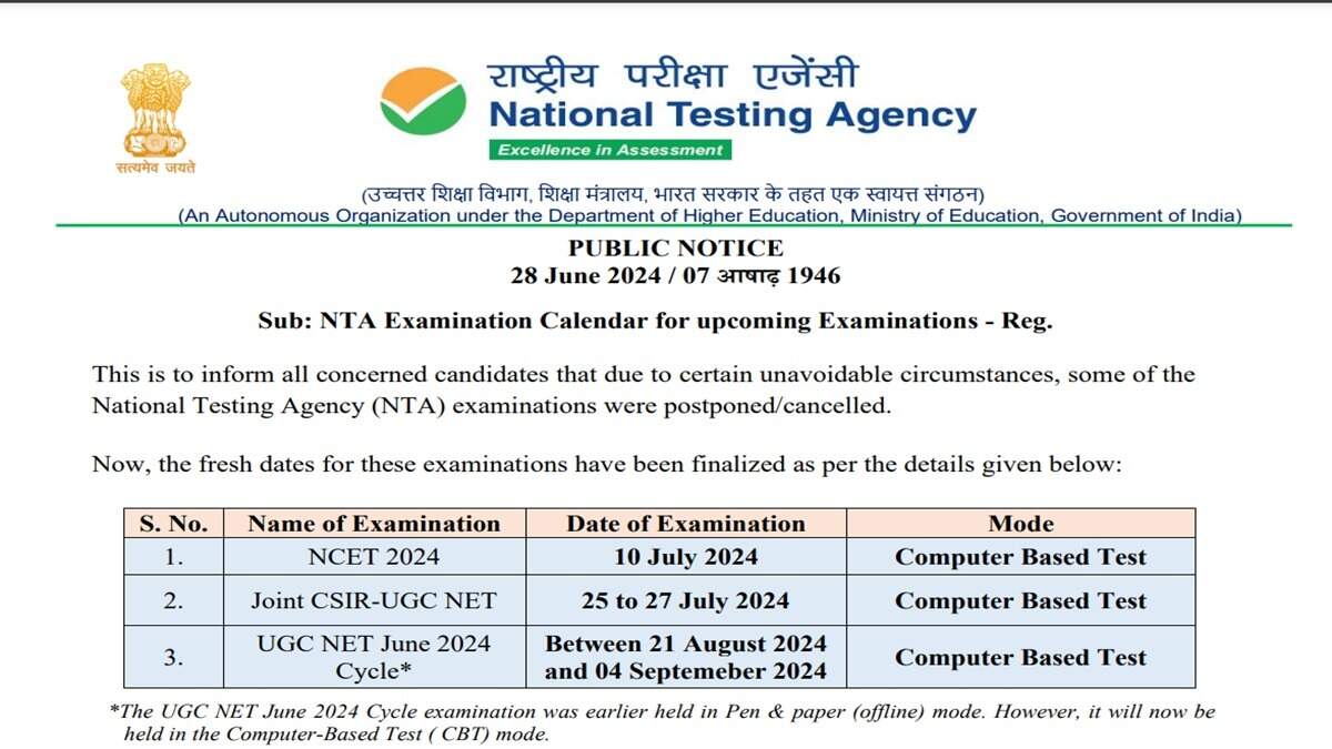 19 जून 2024 को होने वाली यूजीसी नेट परीक्षा को अखंडता के मुद्दों के कारण रद्द कर दिया गया था। यह परीक्षा पहले 18 जून 2024 को दो पालियों में 83 विषयों के लिए ऑफ़लाइन मोड में आयोजित की गई थी।
